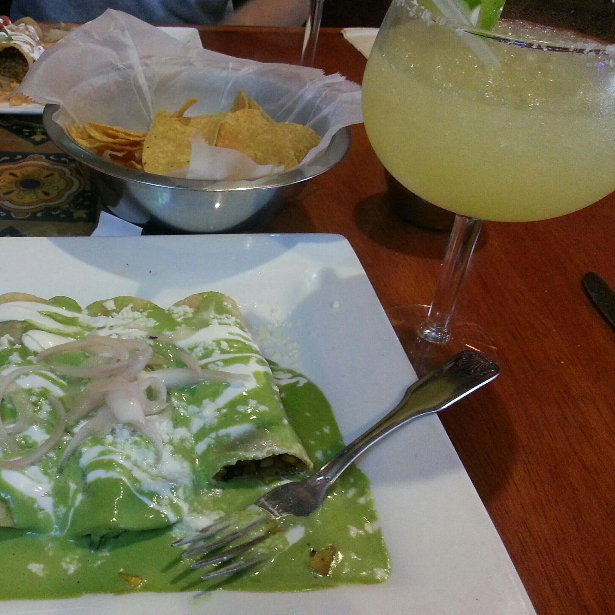 - Mexican food. I. Love. Mexican food. My friends and I go out for it frequently to the nearby Mexican restaurant. I know margaritas are probably one of the worst things you can do to yourself when you're on a diet, but they're so good. I usually order a chile relleno which sometimes is stuffed with meat, but most of the time is stuffed with cheese. I also often get enchiladas stuffed with squash and mushrooms drizzled with spinach sauce and sour cream. This is one of my new favorite dishes.